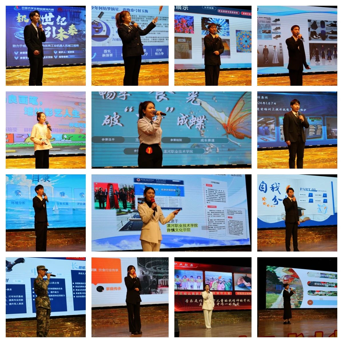 现场展示环节竞争激烈,选手们热情饱满,借助精美的PPT,生动的演讲,清晰阐述职业目标、发展路径及实施计划,分享自己为实现目标所做的努力与准备,充分展现了对未来职业的深度思考和坚定信念。
